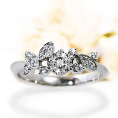 センターダイヤの周り全周にメレダイヤを彫り留めすることで、センターダイヤモンドの輝きが一層際立つリング。