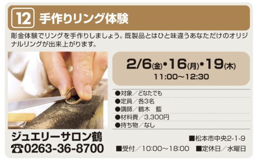 通常¥5,500~の彫金体験ですが、まちゼミ価格で¥3,300でご参加いただけます。